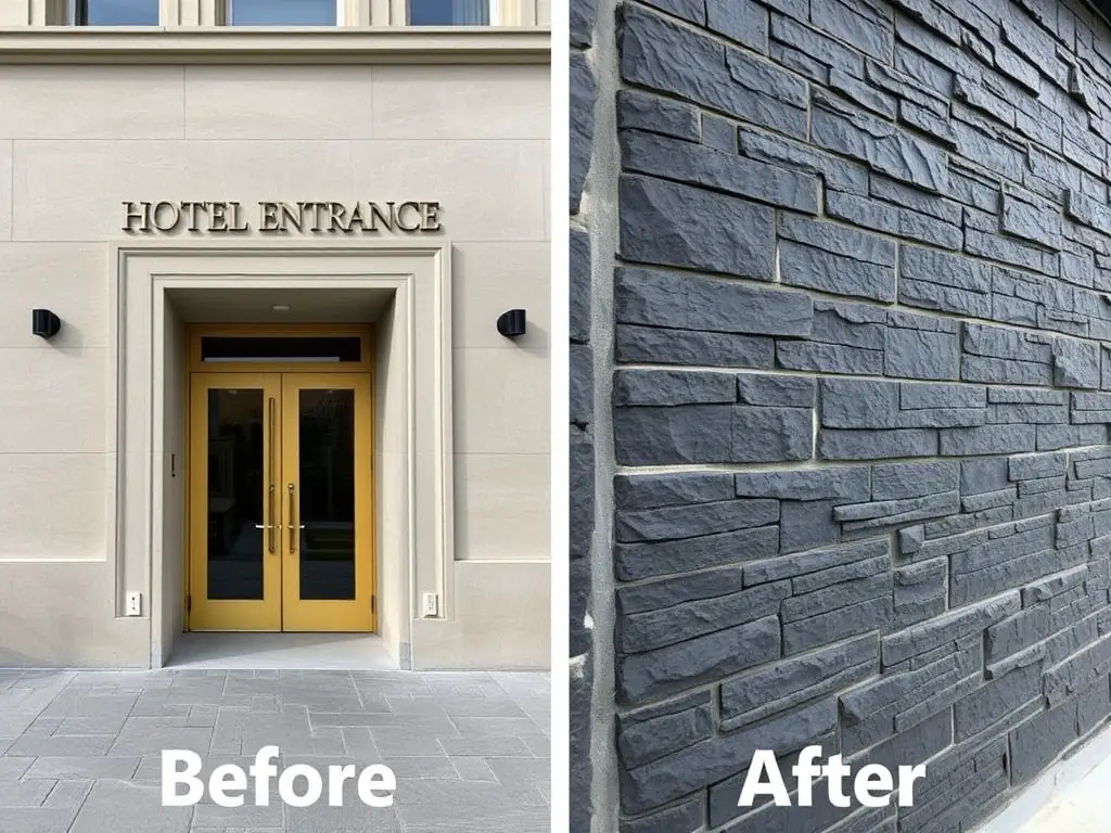 مدخل فندق حديث يستخدم أحجار البازلت للحصول على لمسة نهائية أنيقة ومقاومة للعوامل الجوية.